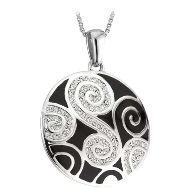 This elegant Irish Necklace features a patterns of Celtic Swirls, decorated with crystal stones on a black enamel disc. This pendant is rhodium plated and comes on an 18 inch chain. Measures approx. 0.9 inch in diameter.