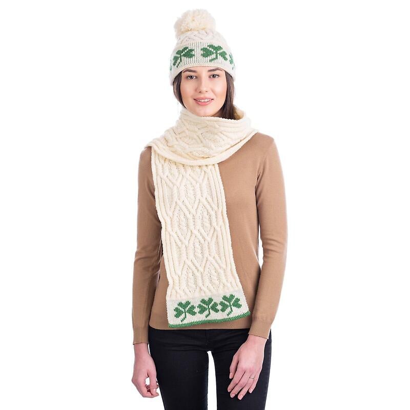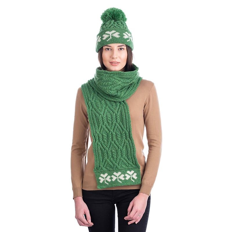 A fun and fashionable Irish ladies hat that is perfect for staying snug and looking great. With its traditional cable knit stitching and a halo of Shamrocks creates a look that is instantly Irish. A bobble on top adds a nice flair. A soft, comfortable feel is provided by its luxurious 100% merino wool composition, which keeps you warm, even on those days that remind you of Ireland's Wild Atlantic coast. Ideal for wear all year round, and the perfect accessory for your St. Patrick's Day outfit. Complete the look with either of our matching scarves code: CLSA10126 or CLSA101025