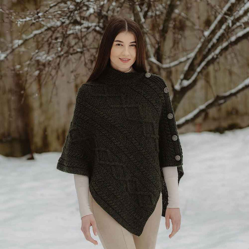 Keep warm with Irish style. This gorgeous Aran knit poncho is ideal for throwing on when the months get colder, or on a cool summer evening. This design takes the finest elements of traditional Irish knitwear and brings them together in a modern look that she'll love to wear. This piece features the iconic diamond and cable patterns found on the classic Irish sweaters of old, combined with a contemporary cowl neck collar which creates a elegant neckline. It is completed with the delightful detail of 4 Celtic Trinity Knot buttons for a look that is eternally Irish. Made from 100% merino wool, this soft, durable fabric ensures you are naturally insulated, while providing a delicate, luxurious feel.