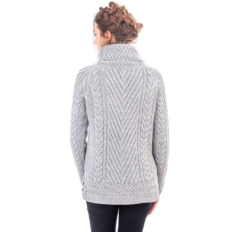 A ladies Irish sweater that looks so good so you will want to wear it all year round. With its fabulous, intricate cable stitching this gorgeous garment evokes the classic aran knit style while updating it with a modern look. The diamond and cable patterns that feature front and back create a sleek silhouette. The mix of merino wool with acrylic gives a smoother feel than natural fibers, while ensure you stay just as comfortable and cozy. The ribbed hem and cuffs along with an adjustable cowl neck ensure that this is easy to wear and moves elegantly with you.