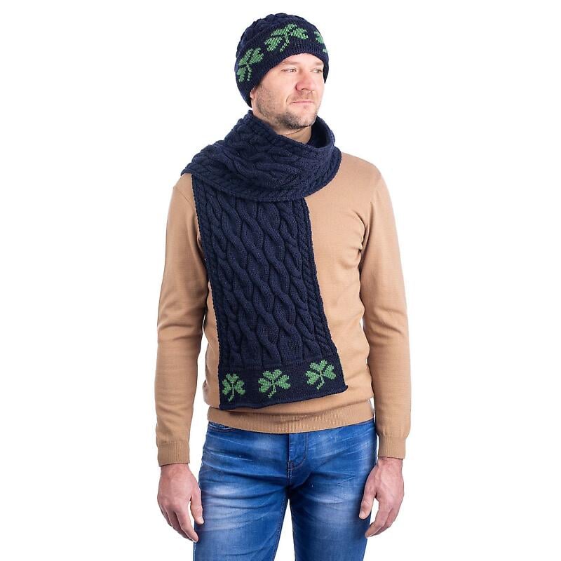 A mens aran knit Irish hat, made from 100% soft, Merino Wool for a cozy, comfortable feel. This classic piece of Irish knit pays homage to the traditional aran styles with its chunky cable knit stitching and a border of shamrocks is said to bring good luck. The ideal accessory for keep your head warm when the temperature drops, you will reach for this stylish piece all round. Perfect as part of your St. Patrick's day outfit. Complete the look with matching mens scarf code: CLSA10143