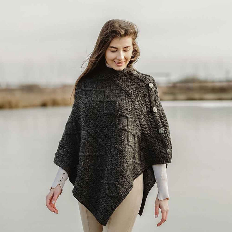 Keep warm with Irish style. This gorgeous Aran knit poncho is ideal for throwing on when the months get colder, or on a cool summer evening. This design takes the finest elements of traditional Irish knitwear and brings them together in a modern look that she'll love to wear. This piece features the iconic diamond and cable patterns found on the classic Irish sweaters of old, combined with a contemporary cowl neck collar which creates a elegant neckline. It is completed with the delightful detail of 4 Celtic Trinity Knot buttons for a look that is eternally Irish. Made from 100% merino wool, this soft, durable fabric ensures you are naturally insulated, while providing a delicate, luxurious feel.