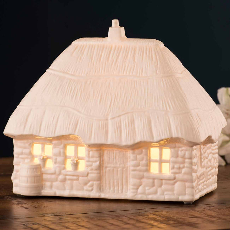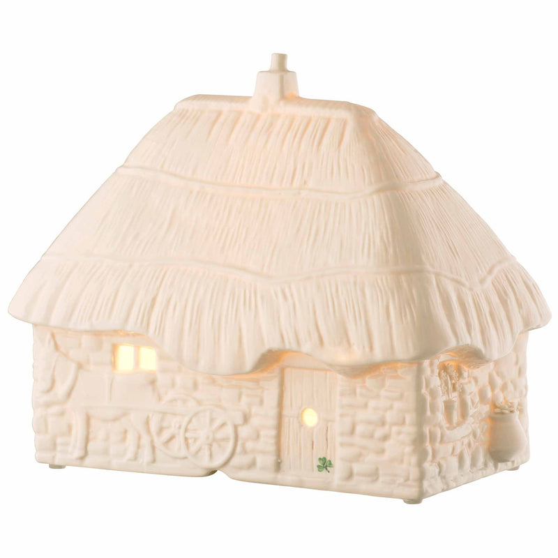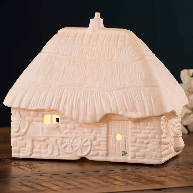 This charming Irish Thatched Cottage Luminaire will brighten up any room and bring a smile to your face. This delightful design, hand crafted in Ireland by Belleek Pottery is based on the traditional Irish farmhouse with its thatched roof. Gorgeous details like the flowerpots on the window sill, the donkey and cart outside, and a milk churn against the wall complete this iconic piece. The hand painted Irish shamrock makes this instantly identifiable as a Belleek classic. This stunning Irish design comes in a Belleek gift box and is a perfect gift for a new home, wedding, or anniversary. Complete your set with 3 other styles also available.