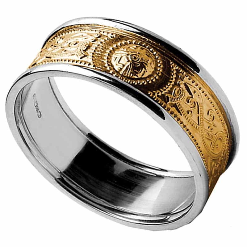 Ladies Celtic Ring and Irish wedding band, in a rich medley of yellow and white gold, and artfully designed with ancient symbols known as the Warrior Shield. Ring width: 0.35 inches. Sizes 4-9 (including half sizes). This ring is made to order. Please allow approximately 10-14 working days for this item to be completed.