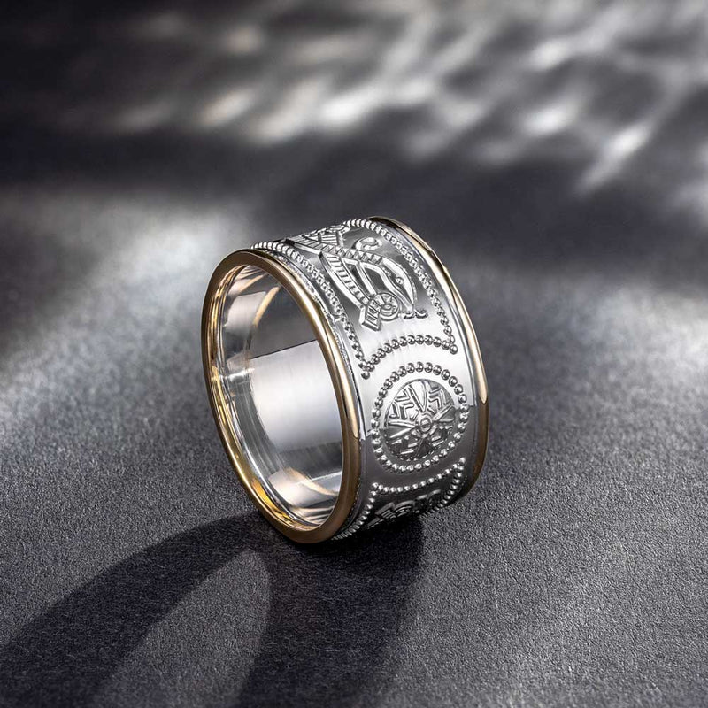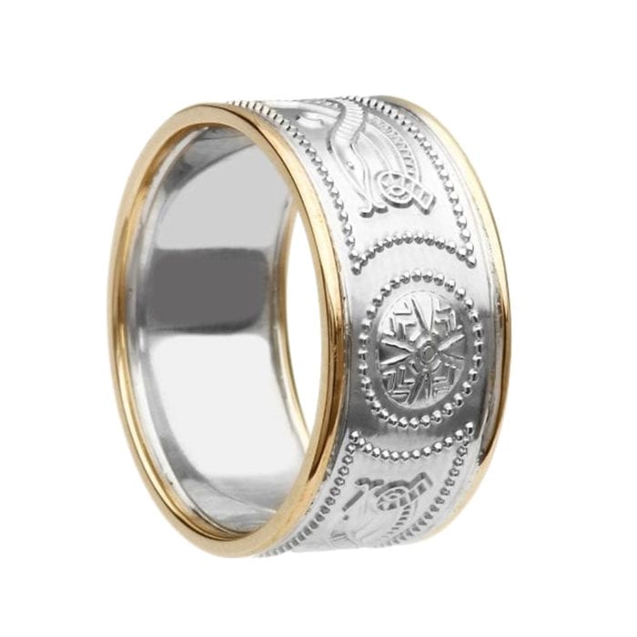 Celtic Ring - Men's White Gold with Yellow Gold Trim Warrior Shield Wedding Band