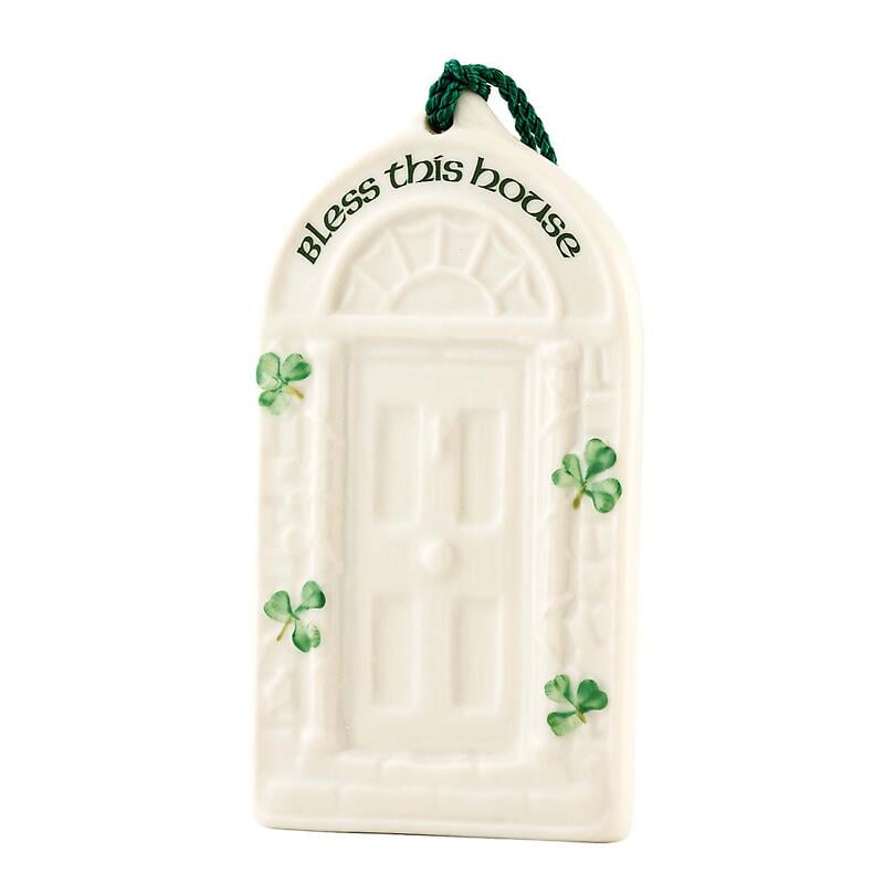 The Belleek House Blessing Ornament has the charm of a traditional Dublin doorway and conveys a heartfelt blessing. 4"H. Handcrafted in Ireland of fine Parian China. Shipped separately - please allow 1-2 weeks for delivery.