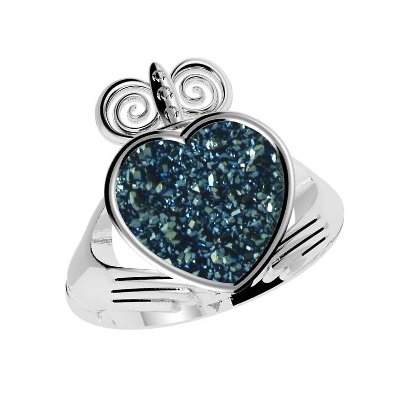Beautiful Claddagh Drusy Ring, the heart symbolizes love, the crown loyalty and the hands friendship. Drusy is a beautiful sparkling stone, many millions of years old. A member of the quartz family, the word Drusy literally means covered in tiny crystals. Handcrafted in Dublin, Ireland & hallmarked in the Assay Office in Dublin Castle. Sizes 5-9 (no half sizes) 0.7" from crown to tip of heart