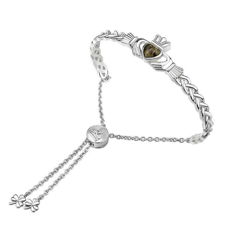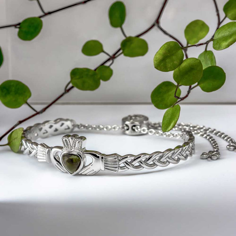 An Irish bracelet that combines the best of all things Irish. This attractive Sterling Silver bangle features the beloved Claddagh. An enduring symbol of Celtic romance for generations, this iconic Irish design is made up of the Heart, Crown and Hands to symbolize Love, Loyalty and Friendship.