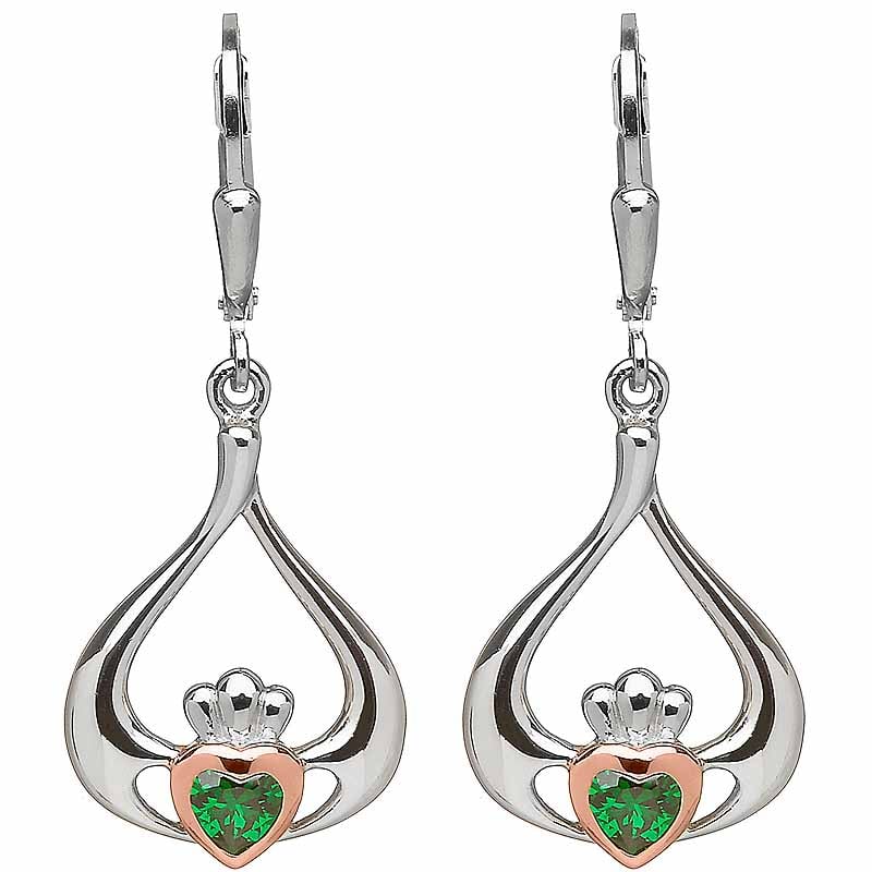 A pair of Irish Claddagh Earrings with pure Irish 10k Gold. These superb sterling silver drop earrings feature the beloved Claddagh symbol with a green stone at its heart surrounded by an accent of rare rose gold from Ireland. The Heart symbolizes Love, the Crown stands for Loyalty and the Hands represent Friendship.