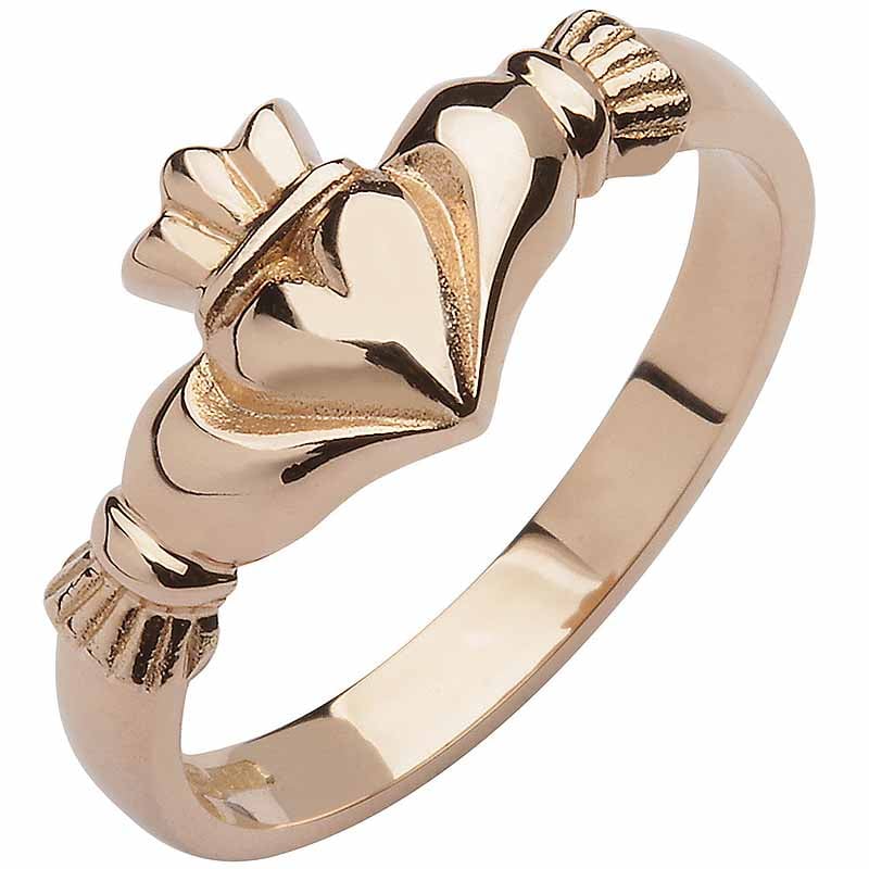 An Irish Rose Gold Claddagh Ring, breathtaking in its simplicity and beauty. This 10k Gold band symbolizes Love, Loyalty and Friendship in an elegant, contemporary design. Also available in Yellow Gold.