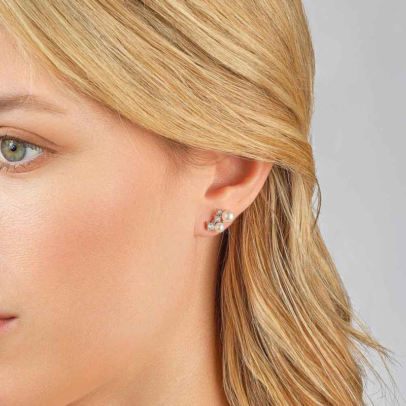 Description: A pair of sterling silver pearl earrings that will delight any bride to be. Shimmering pearls and sparkling crystal cubic zirconia make for an elegant, eye-catching pairing. Perfect for your special day and a way to accessorize any outfit from the everyday to evening wear with a touch of glamour.