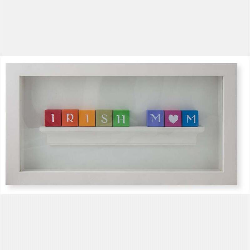 An ideal gift for mom. Our Irish mom framed hanging wall plaque comes in a white, painted timber frame and contains colorful, hand-pressed alphabet blocks in a Celtic typeface for that extra Irish touch, beautifully mounted on a shelf. The 'o' is represented as a heart to show how much she is loved.