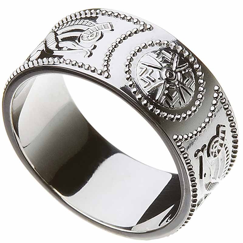 Men's extra wide sterling silver Celtic Ring and Irish wedding band patterned in ancient Celtic symbols known as the Warrior Shield. Ring width: 0.35 inches. Size 13 (including half sizes).