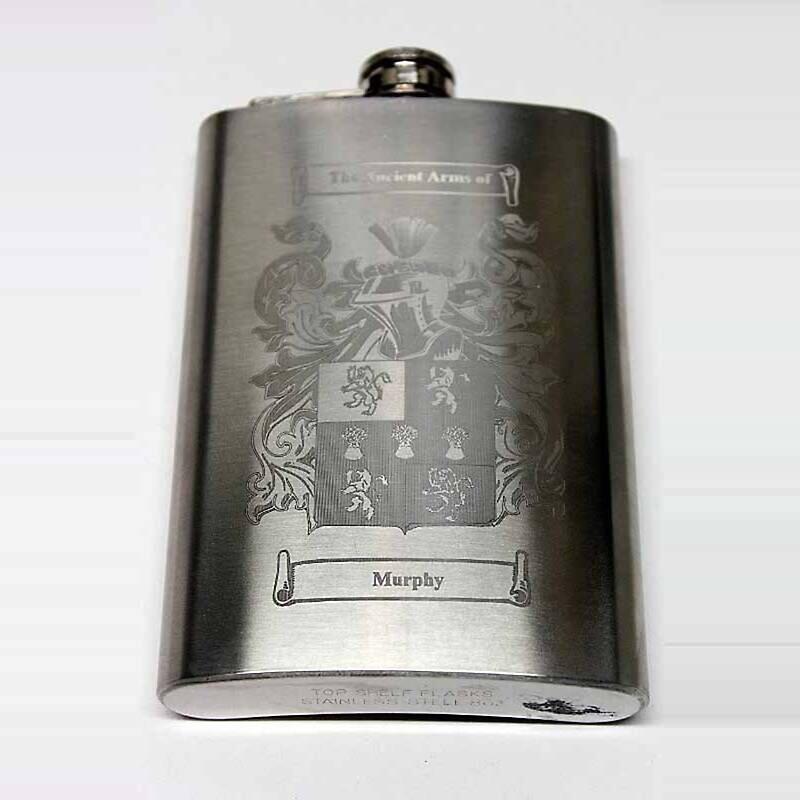 Your family name and coat of arms will be laser etched on this 8oz stainless steel hip flask. The perfect gift for a man whatever the occasion. Irish Coat of Arms flasks make great presents for groomsmen and wedding parties, for a husband on his anniversary, a brother on his birthday or for dad at father's day. Make it extra special with our gift set which comes with 2 cups and a funnel for pouring, in a presentation box. Made from 201 stainless steel. Capacity 8oz. Measures .4mm thick