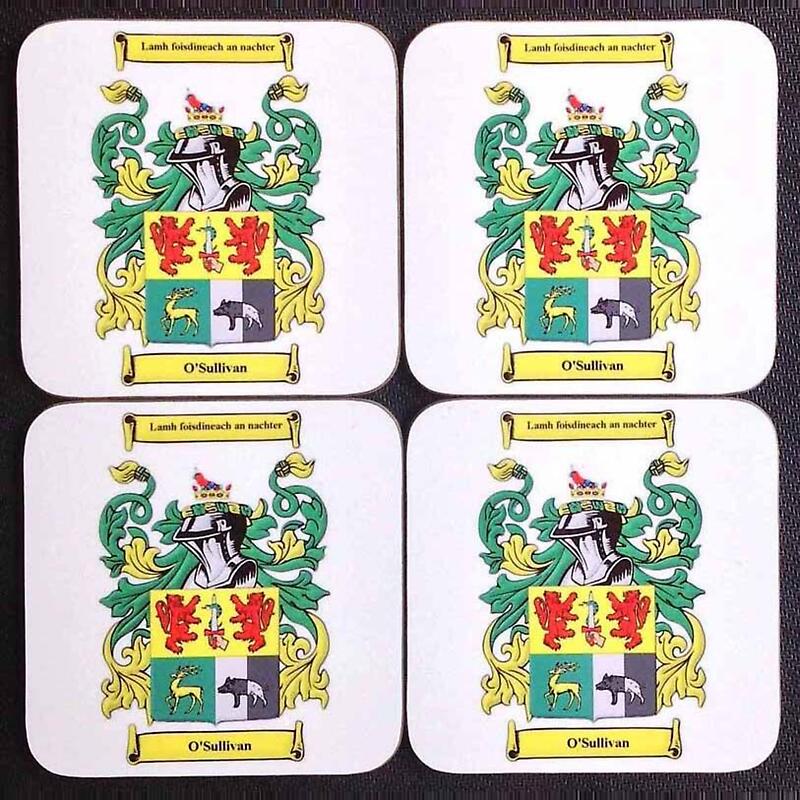 This colorful set of Irish Coat of Arms Coasters make a great accompaniment to any drink. Whether you are setting down your Irish whiskey, or need a beer mat for your Guinness, these hardboard gloss coasters printed with your family's coat of arms are sure to be what you reach for. Impress guests and friends with this piece of your history, a great conversation piece and a gift that will be loved by any proud Irishman or Irishwoman. An ideal gift for family at Christmas, birthday's or a father's day gift for the man who loves his Irish heritage. Check our out coat of arms glassware too.