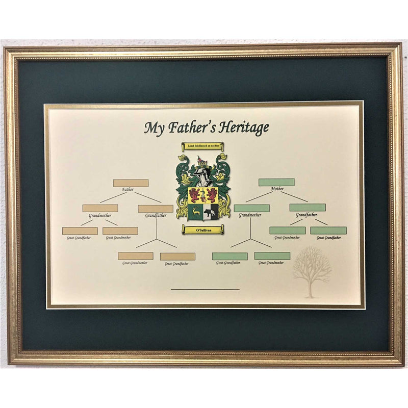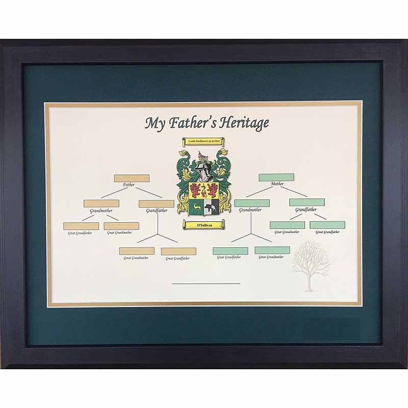 Father's Irish Family Tree is celebrated in this attractive framed print. Dad's historic family coat of arms is rendered in full color with space to enter the names of his father, mother, grandfather, grandmother and great grandparents. A fantastic gift to cherish the Irishman in your family. Ideal for those who already love to tell the stories of the ancestors from Ireland, or for those who are only just discovering their Irish lineage.