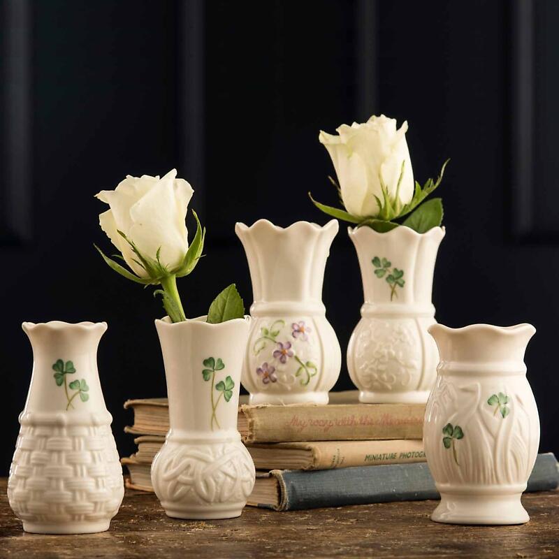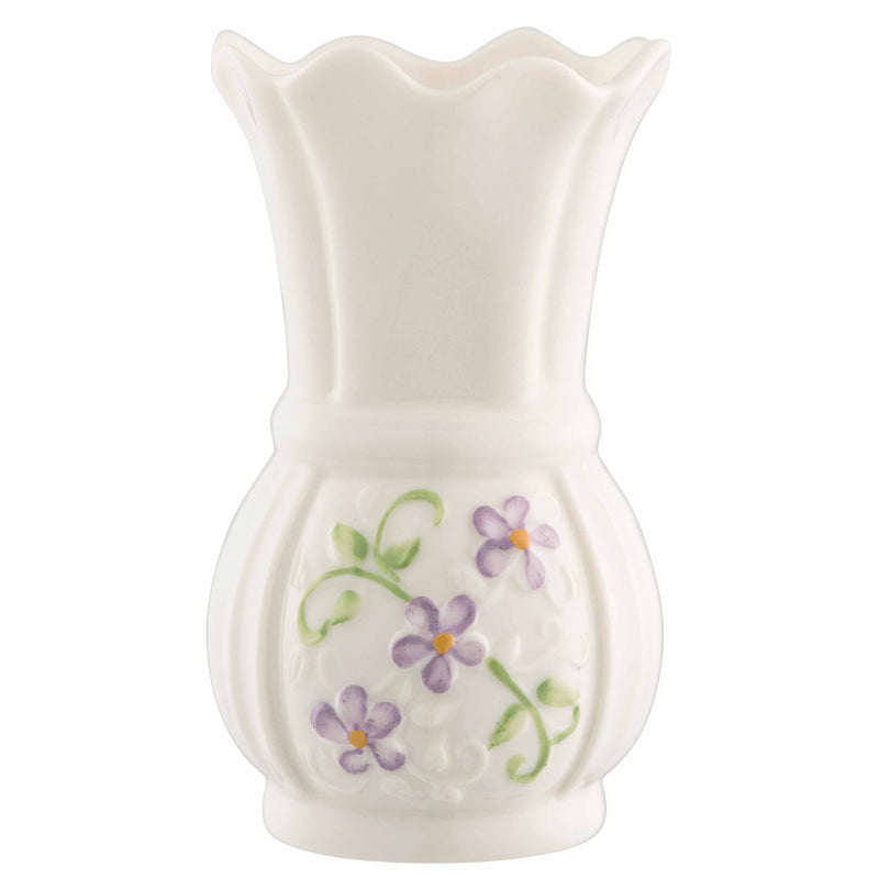 This charming mini vase is made in Ireland by Belleek Pottery. It is hand painted with the gorgeous pastels of the Irish flax plant. With its beautiful purple flowers, flax was at the heart of the famous Irish linen industry for generations. A celebration of Irish design and heritage, this delightful vase is both decorative and practical. Ideal for adding a splash of color to any home. A perfect complement to the rest of Belleek's Irish flax designs, or their mini-vase collection. These gifts are perfect for special occassions like weddings, anniversaries or a new home.