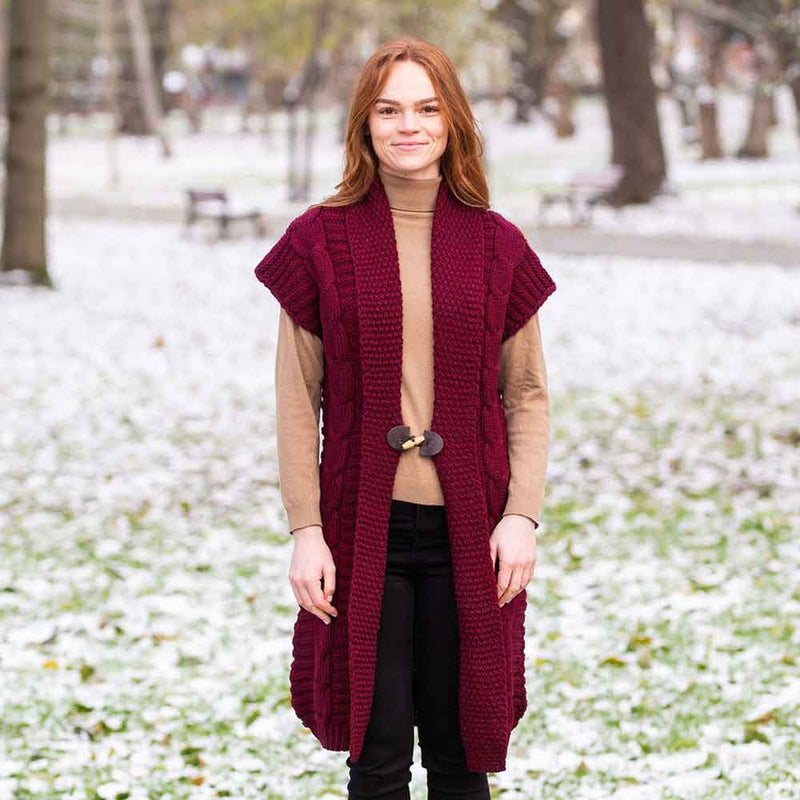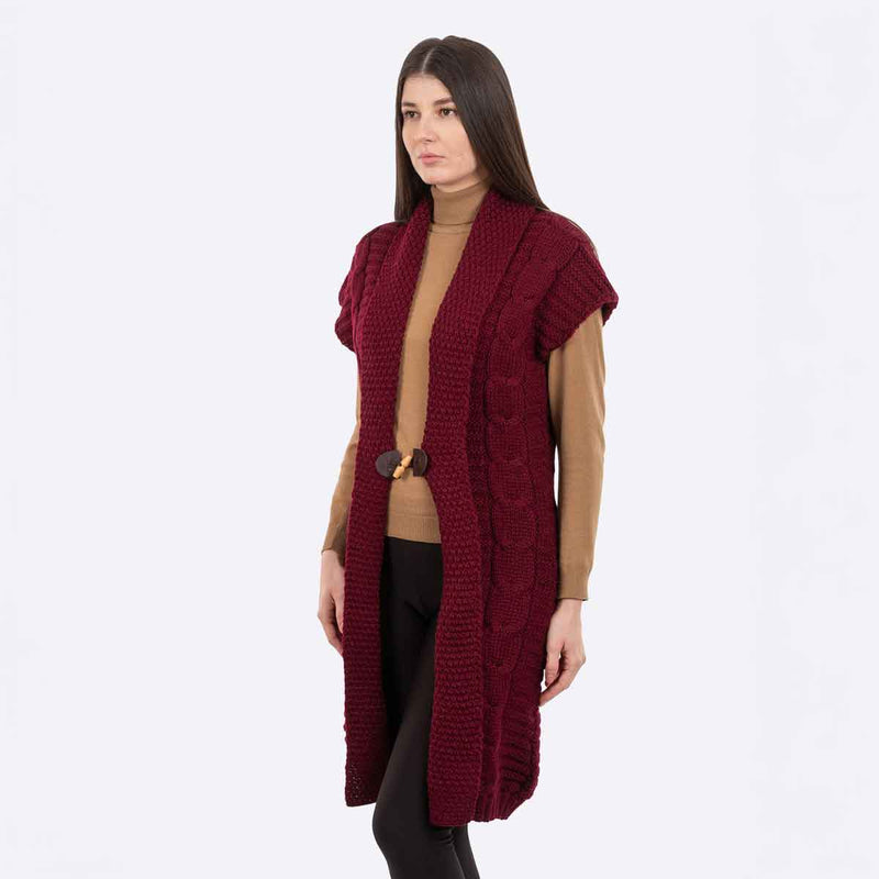 Embrace comfort and tradition with this fabulous Irish sleeveless cardigan. Made from 100% virgin wool, it is soft and cozy, and is ideal for pairing with your everyday look to add a touch of elegance and cultural heritage to any outfit. Inspired by traditional Aran knitwear it features the cable stitch and moss patterns which represent the origins of this design from the islands around Ireland's Atlantic coast and the lush green countryside of the Emerald Isle. This versatile garment is comfortable and breathable, ideal for wear all-year round.