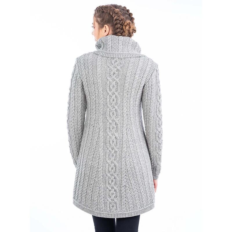 Stay warm and look great with this fabulous Irish coat. This iconic Irish design features intricate aran cable knit stitching front and back. The warm and cozy merino wool and acrylic blend ensures a smooth, silky touch. A feminine and fashionable look that lends sophistication to any of your closet favorites. Its mid-length hemline and asymmetrical collar, with two side pockets are sure to keep you cozy when the temperature drops or in the cool evening air.