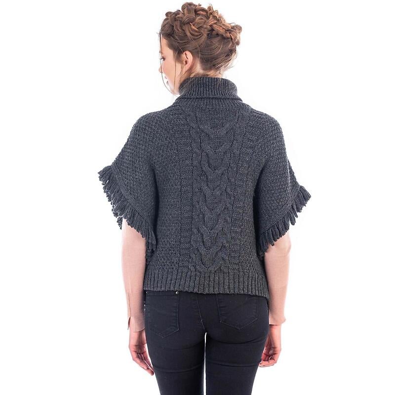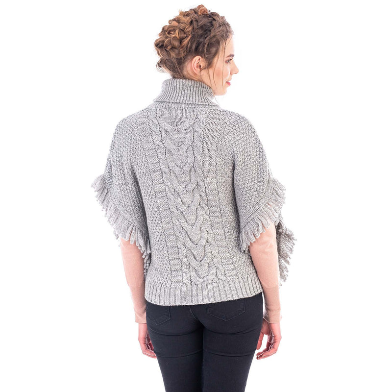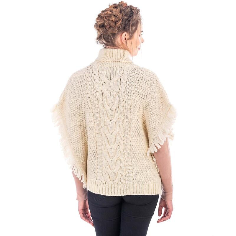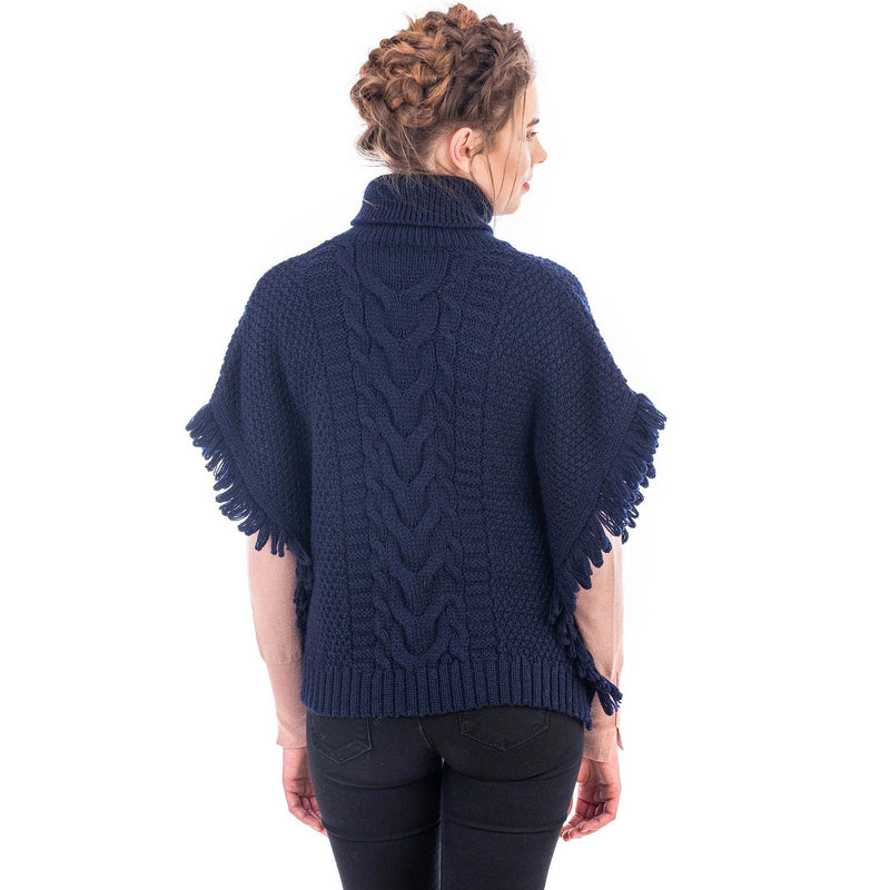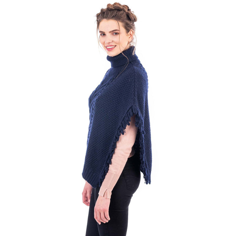 A gorgeous ladies wool poncho with a touch of Irish flair. A bold aran knit stitch, front and back is the centerpiece of this 100% Merino Wool style icon. A ribbed hem and cowl neck collar provide a flattering fit, with fringed sleeves. Easy to wear and great looking, this is the piece to throw on to wrap up warm without compromising on style. One size fits most.