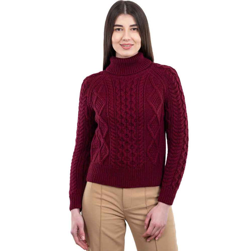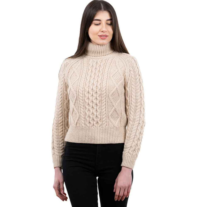 Don't compromise, choose this Aran Knit Irish Sweater that is both classic and contemporary. This stylish ladies sweater takes combines your favorite traditional stitches from the iconic Irish design and makes a garment any Irishwoman will love to wear day in and day out. The honeycomb, cable and diamond patterns are among those that make up this elegant pattern. It is cozy and comfortable, with a fabulous, feminine fit. A deep turtle neck collar, ribbed cuffs and hem in conjunction with breathable, natural fibers of 100% merino wool make this ideal for Fall or Winter wear while looking great.