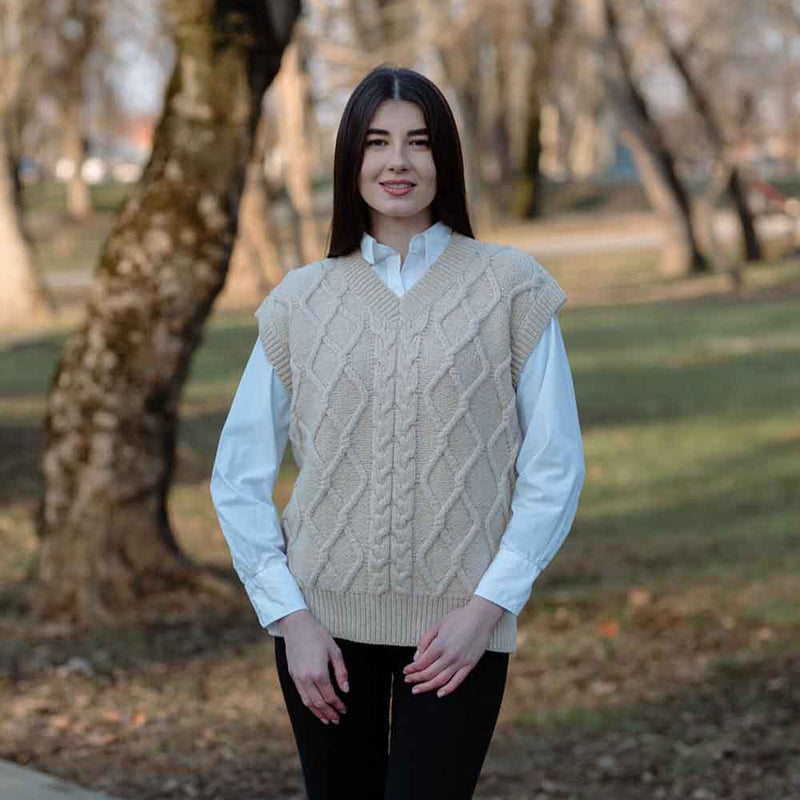 For an Irish look that goes with anything, you don't need to go any further than this classy oversized Aran vest. Add a touch of Ireland to your outfit by throwing this versatile vest over on. It takes elements of the iconic Aran sweater from Ireland, like the cable and diamond stiches and combines them with details like the trendy v-neck and ribbed him for a genre-spanning piece that is always in fashion from college campus to the country club. Perfect for putting on over a shirt on a spring day, or summer evening or ideal for layering up in Fall and Winter. Made with 100% merino wool, natural fibers with a soft, luxurious feel that won't itch. Any Irishwoman will adore this.