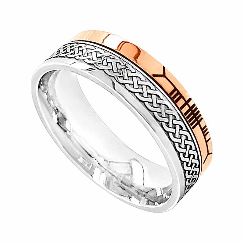 Stunning Celtic Ring featuring a Celtic knot design in Sterling Silver and a 10K Yellow Gold rail inscribed in Ogham with the word 'faith'. The width of the ring is 0.27 inches/7mm.