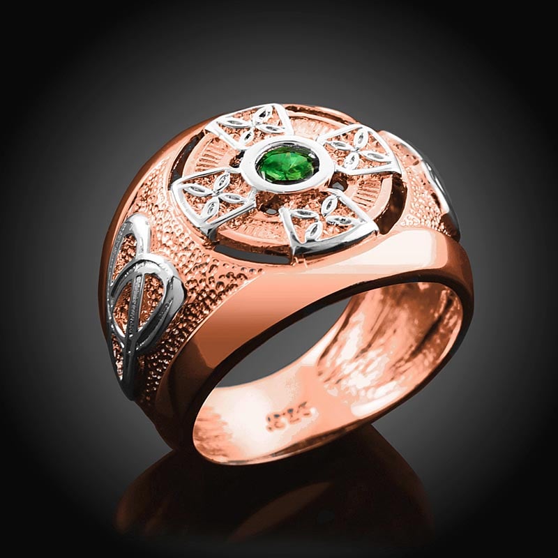 Celtic Ring - Men's Two Tone Rose Gold Celtic Green Emerald CZ Ring
