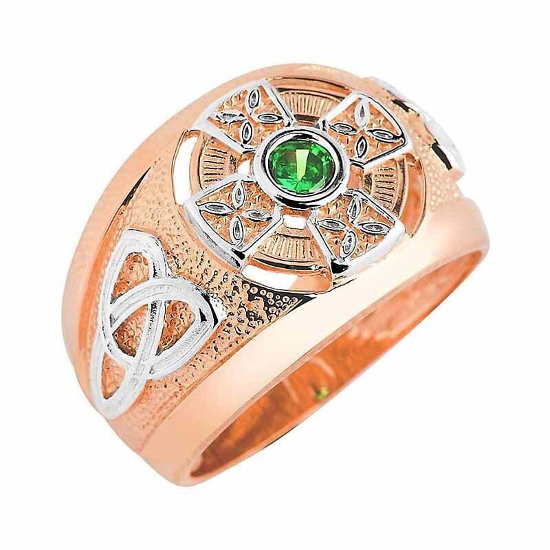 The heavyweight Men's Celtic Ring is an expression of Irish pride. Designed in two tone 10k or 14k Rose Gold and with a Celtic Cross pattern centered with a emerald CZ and Celtic knot work on sides. Made in the USA in sizes 4-16 including half sizes.