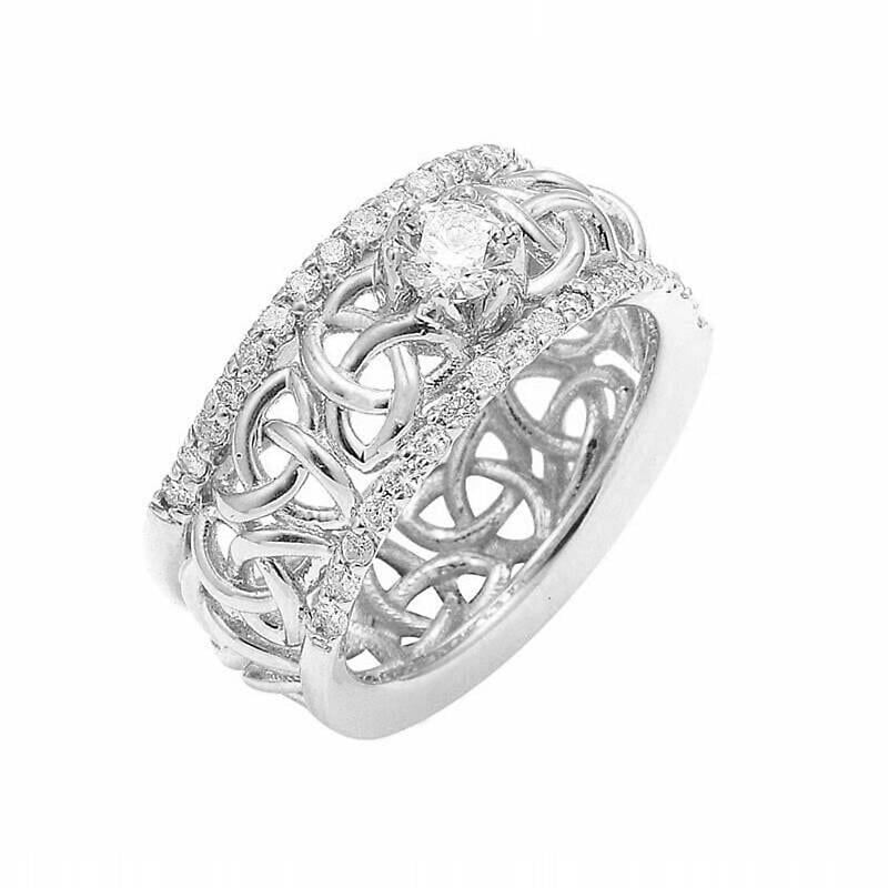 The Trinity Love Knot graces the center border of this lovely 10k and 14k White Gold Celtic Wedding Ring, both ends meet at the 0.25 ct. center diamond, enhanced by 36 glittering smaller diamonds, combined are 0.54 ct. The diamonds on this splendid wedding ring are all of vs2 quality! Made in the USA. Sizes: 4-12 (including half sizes).