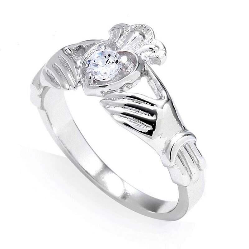 This white gold newly designed diamond Claddagh Ring is very rich in gold. Weighs over 4 grams of 14k gold. The details on this ring is fabulous and over 0.22 carat diamond gives the ring more sparkle and value. Proudly crafted in the USA. Sizes 4-16 (including half sizes)