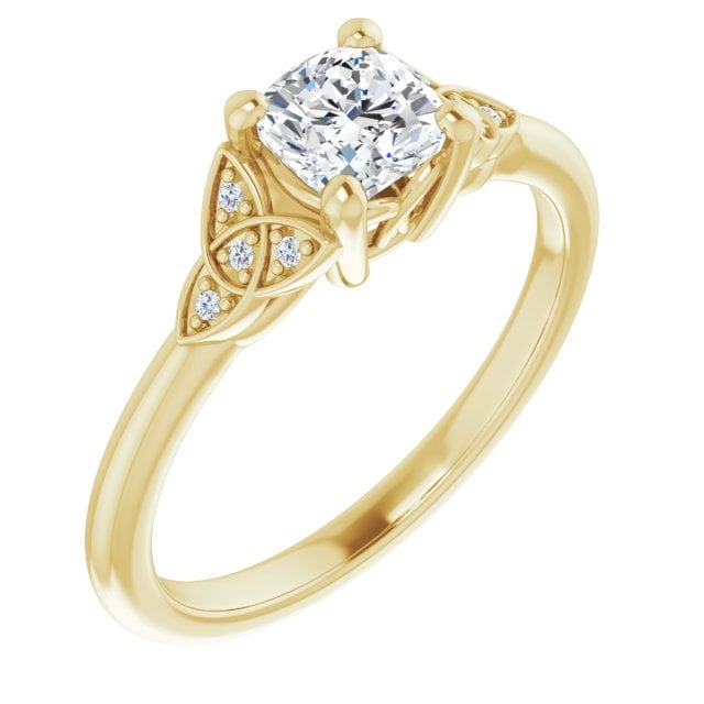 An Irish Engagement Ring that exudes Celtic romance. This 14k Yellow Gold ring is set with a 0.75 carat cushion shaped diamond at is heart. 8 more diamonds sit either side, within the richly symbolic Celtic Trinity Knot. Having no beginning and no end, this iconic design represents enduring Love, Faith and Friendship. Its interconnected pattern is the perfect symbol for a couple coming together in unity. She will delight in the deep meaning and dazzling diamonds in this truly special Celtic ring.