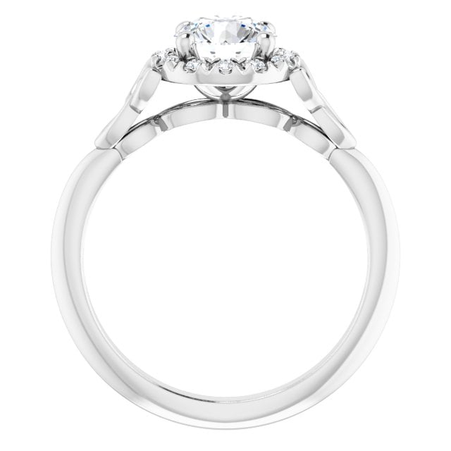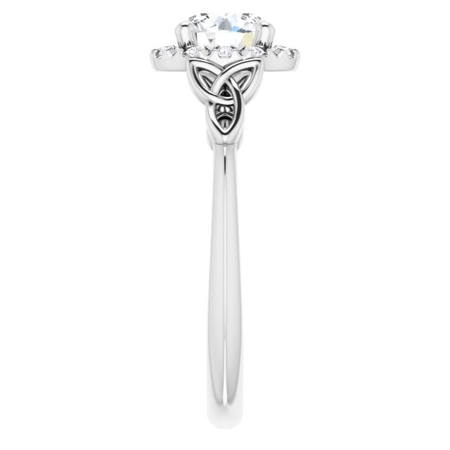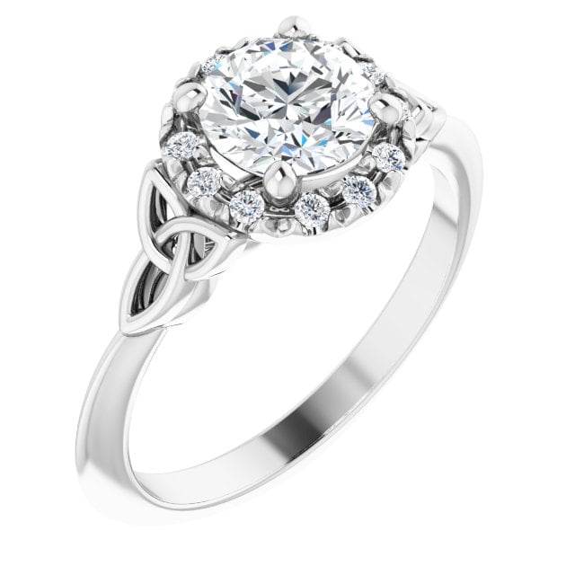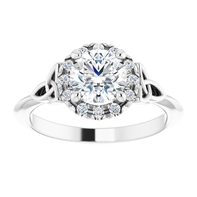 A diamond Celtic Engagement Ring that delights with its dazzling brilliance. This fabulous design features a 1ct diamond at its center surrounded by a halo of diamonds. The 14k White band is designed with Trinity Knots on either side for a style that will the envy of everyone. Your feelings are symbolized in this enduring Irish symbol which represents the everlasting, having no beginning and no end. It has been used as a meaningful motif for countless generations and is beloved for rich heritage. This stunning Celtic engagement ring is a piece of jewelry as timeless as your love for one another.