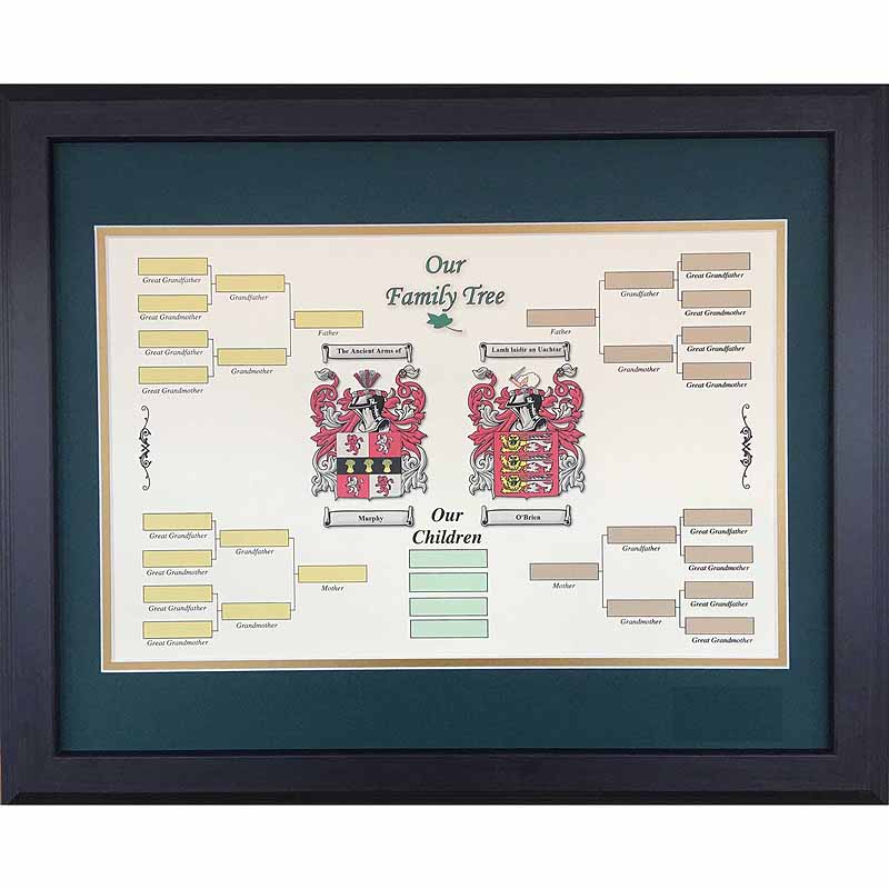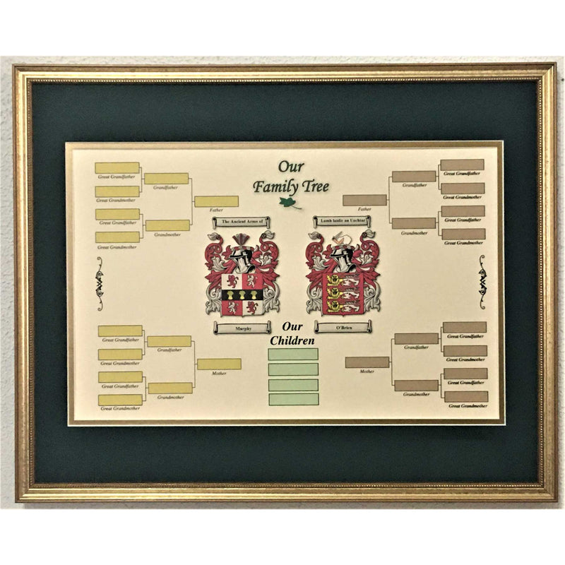 An Irish heirloom gift that will be treasured by all generations. Celebrate the origins of both sides of your family with this exquisite Family Tree print. Framed with vibrant color prints of your historic coats of arms, the durable card has space for both your ancestors and children. With boxes for details of Mother, Father, Grandmother, Grandfather, Great-Grandparents and the kids, this honors not only your forebears, but allows you to continue your family story, with the kids too. A great gift for an annivesary, wedding or special occasion.