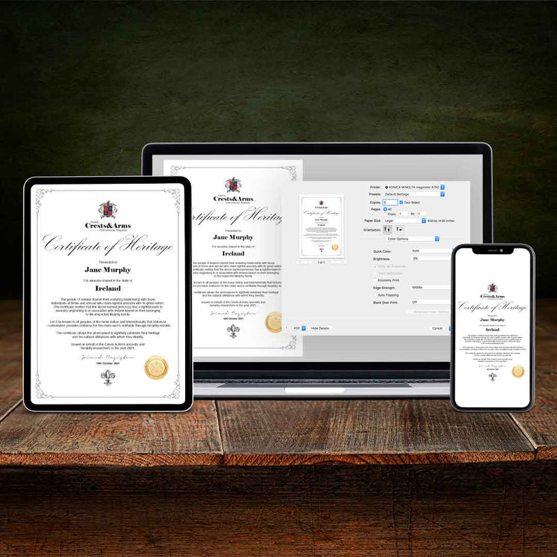 Whether you're wondering about your own ancestry, looking to showcase your heritage in the home or office, or need a quick, last minute gift, our digital certificate is ideal.