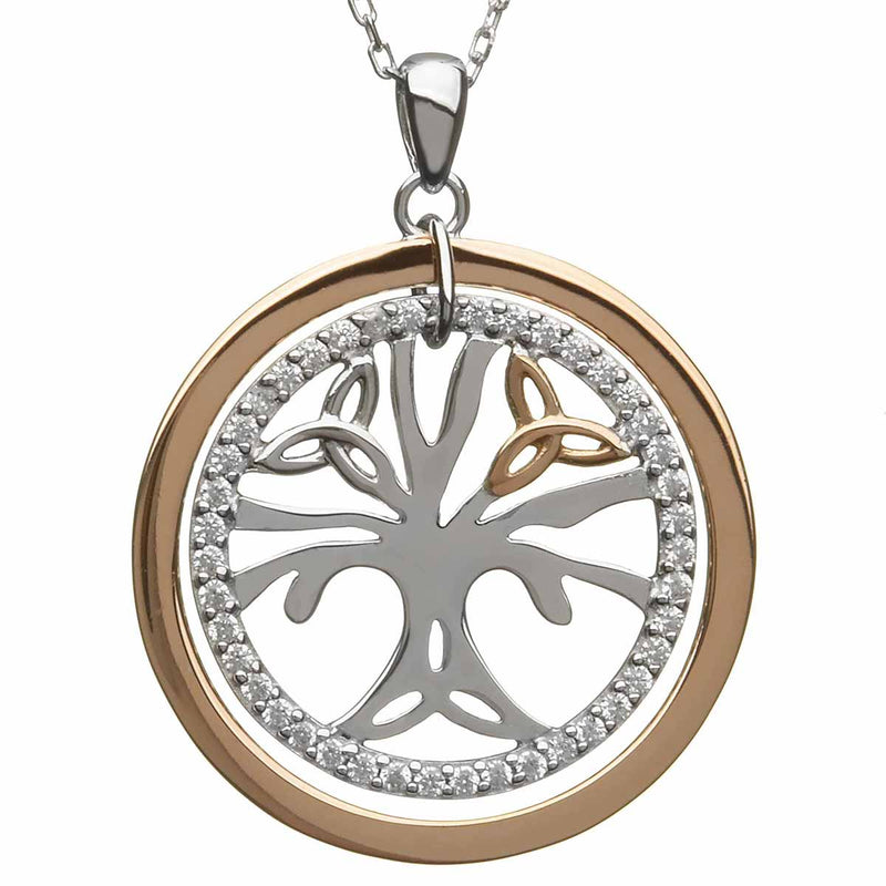 A breakthing Celtic Necklace, features two layers a Sterling Silver represenation of the Tree of Life surrounded by sparkling crystals and an outer circle of rare Irish 10k gold, mined in Ireland. The Celtic Tree of Life pendant symbolizes Heritage in its roots, Strength in its trunk and Growth in its leaves. The outer circle represents the eternal, having no beginning and no end. This piece of uniquely Irish Jewelry also contains the Trinity Knot symbol again, in Rose Gold, an iconic Irish motif repersenting the everlasting.