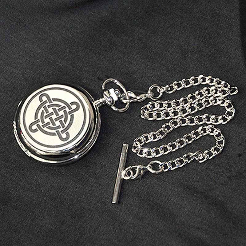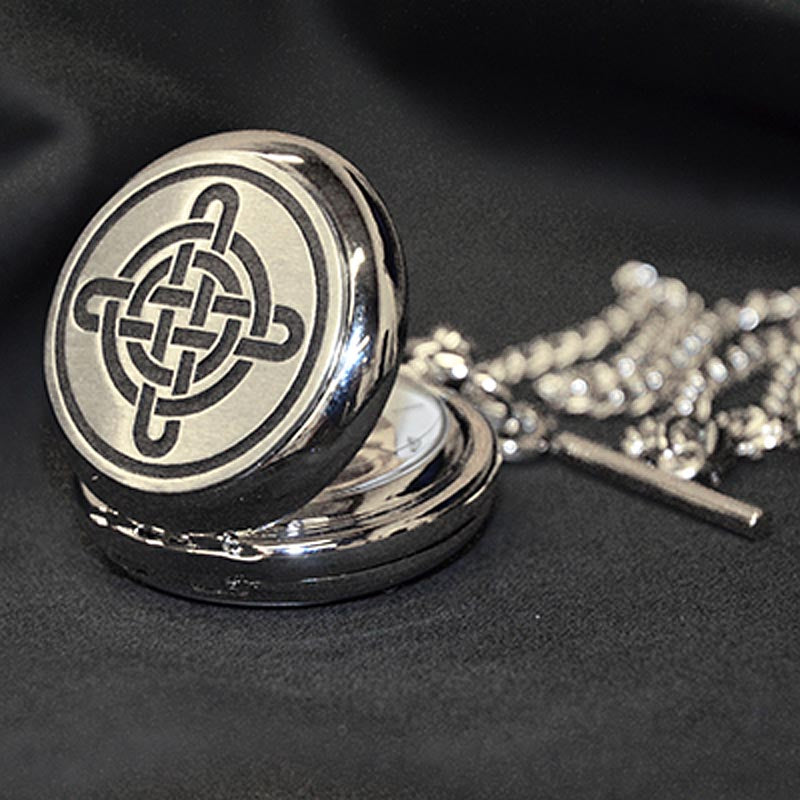 This Irish Pocket Watch features a pewter Celtic Knot design on the front. The inside of the watch features the mechanics of the watch and operates by winding the top mechanism. A perfect gift for that special man in your life! The pocket watch is complete with a chain and comes in a presentation box.