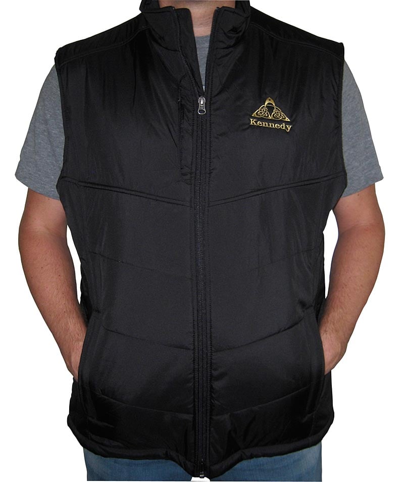 Our Personalized Black Quilted Vest provides warmth without the bulk! The vest features a full front zip, 2 side zip pockets, a hidden chest zip pocket, inside pockets and toggle hem closure. 100% water resistant and insulated polyester. Embroidered in the USA. Sizes S, M, L, XL, XXL, 3XL, 4XL. Shipped separately - please allow 3-4 weeks for delivery.