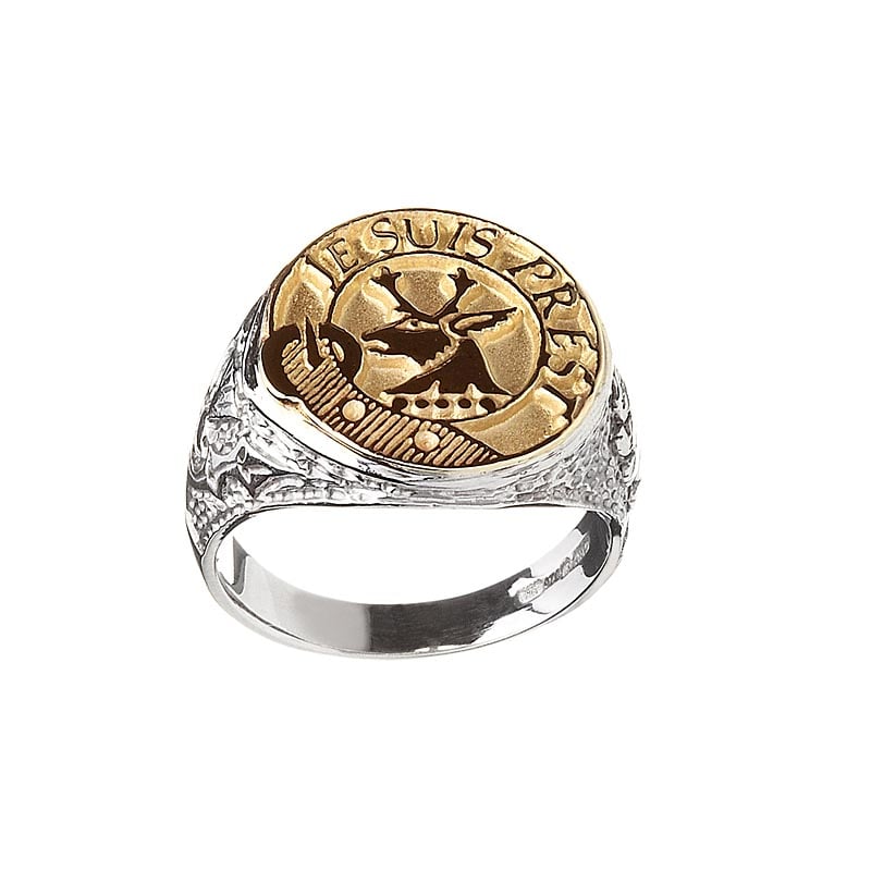 This Celtic Coat of Arms Ring comes in sterling silver with a 10k yellow gold solid Scottish style clan crest engraving. Show off your Scottish pride in style with this intricately engraved ring which is desgined to feaure your clan motto and coat of arms on this elegant ladies Celtic Ring. Not restricted to just Scots coats of arms, can be made with any name or family crest.