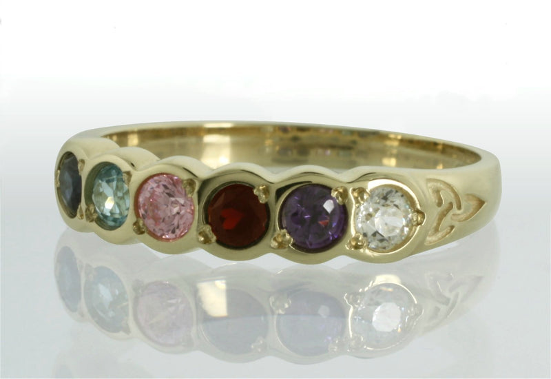 The Family Birthstone Ring is accented with Trinity knot design. Each stone represents a family member's birthstone. Available in 2-6stones. Made in Ireland. Hallmarked in the Assay Office in Dublin Castle. Available in sterling silver, 10k gold, 14k gold and 14k white gold. Sizes 5-9 (including half sizes) 0.2" wide