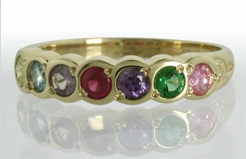 The Family Birthstone Ring is accented with Trinity knot design. Each stone represents a family member's birthstone. Available in 2-6 stones. Made in Ireland. Hallmarked in the Assay Office in Dublin Castle. Available in sterling silver, 10k gold, 14k gold and 14k white gold. Sizes 5-9 (including half sizes) 0.2" wide