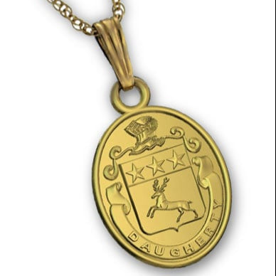 Expert craftsmanship and sharp detail in this personalized Irish Necklace. Sterling Silver Oval Family Crest Pendant. Cut with raised detailing. Features: Arms (shield), Helmet & Mantling and Name Ribbon Oval Shaped. Comes with 18 inch chain. Pendant Size: 22mm X 18.5mm Weight 8 to 12 grams depending on Metal used (Currently only available in Sterling Silver). Made in Ireland and hallmarked by the Assay Office in Dublin Castle.