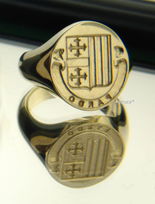 In times gone by, when sending correspondence the sender would secure the documents by melting wax over the join or closing point, and make an impression in the warm wax with their Ring Seal. This would ensure that the receiver would know if the correspondence was genuine and that it had not been tampered with. This Irish Ring would often be passed down the generations within a family. Features: Arms and Name Ribbon. Large Size. Oval Shaped. Deep engraved. Each Family Name has a Unique Coat of Arms. Made in Ireland and hallmarked by the Assay Office in Dublin Castle. Sizes 6-13 (including half sizes). FREE Presentation Box. FREE Sample Wax Seal from your own ring. FREE Stick of Sealing Wax to make your own seals. Ring Face Size: .75 inches. Weight:18 to 28 grams, depending on Metal. This ring is made to order. Please allow approx. 10-14 working days for this item to be completed.