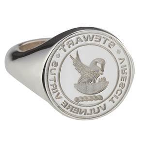 Your Scottish Family crest is expertly engraved in this stunning Sterling Silver ring. Crafted in the Scottish style, your motto appears within the buckle with the crest at its center. This is a SEAL Ring - details are reversed. Made in Ireland and hallmarked by the Assay Office in Dublin Castle. Sizes 6-13 (including half sizes). Ring Face Size: .5 inches. Weight:18 to 28 grams, depending on Metal used. This ring is made to order. Please allow approx. 10-14 working days for this item to be completed