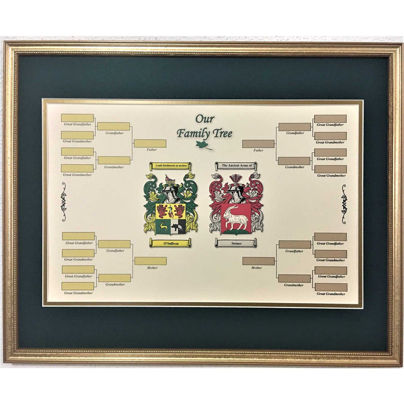 The coming together of two families, celebrated in this beautiful framed family tree print. Both families historic coat of arms are featured in full, vibrant colors on the durable card upon which you can fill in your ancestors. These spaces record your mother, father, grandmother, grandfather and great grandparents. Ideal as a wedding or anniversary gift, or for a new home. The perfect way to honor your connections to Ireland and elsewhere.
