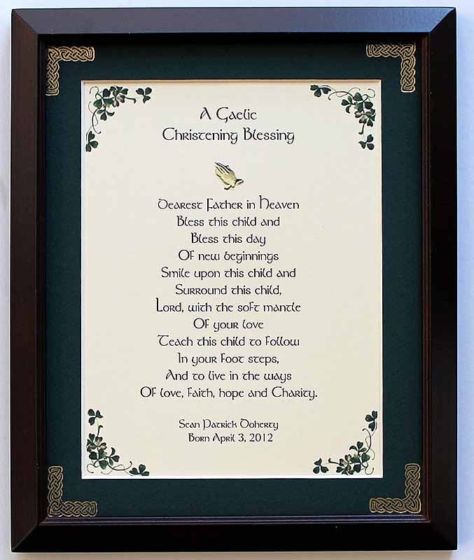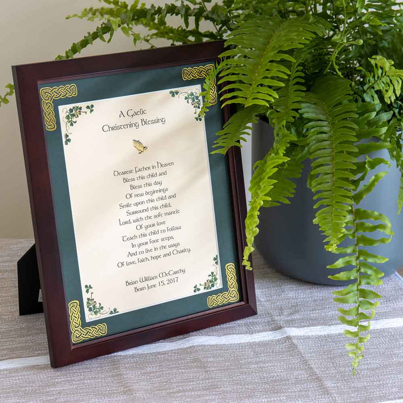 "A Gaelic Christening Blessing: Dearest Father in heaven bless this child and bless this day of new beginning smile upon this child and surround this child. Lord, with the soft mantle of your love teach this child to follow in your foot steps, and to live in the ways of love, faith, hope and charity." Our Personalized Gaelic Christening Blessing Framed Print is the perfect gift for any new baby! Personalize the print with up to 2 lines of personalization up to 30 characters per line. The print comes matted with a dark walnut frame. 8" x 10". Stand or hang. Also available with a photo opening. Shipped separately - please allow 2-4 weeks for delivery.
