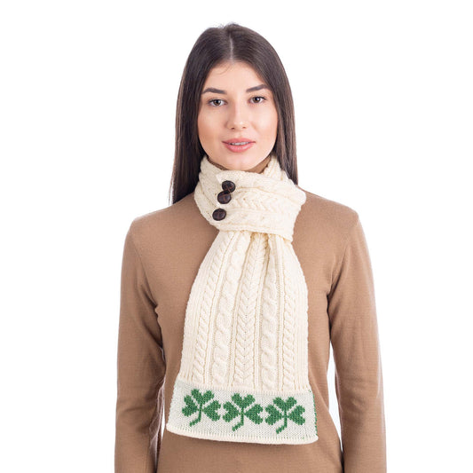 Irish Scarf | Merino Wool Aran Knit Shamrock Pattern Ladies Loop Scarf with Buttons