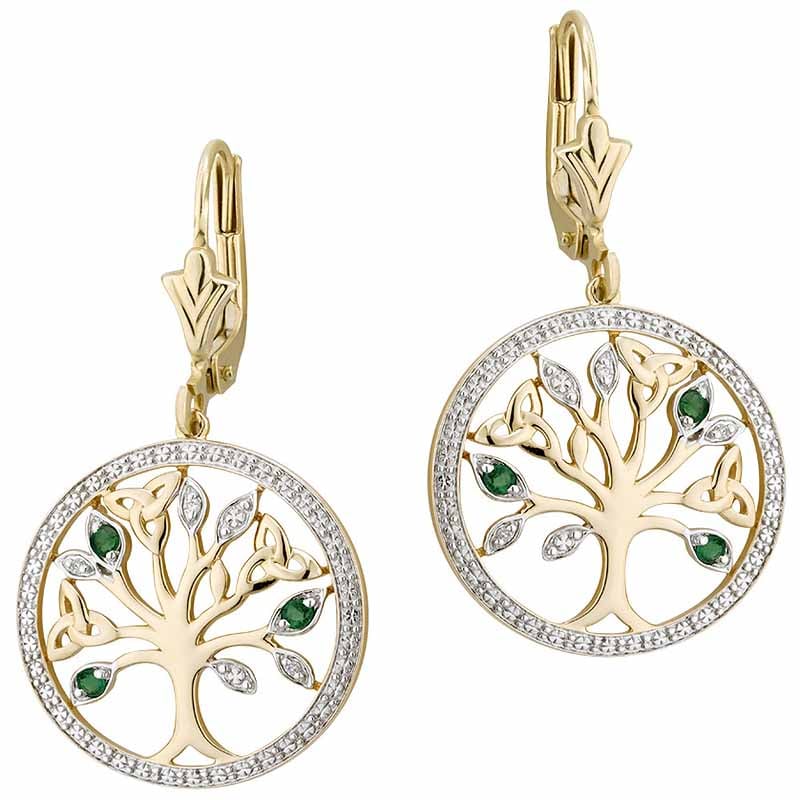 Irish Earrings - 14k Gold with Diamonds and Emerald Tree of Life Earrings