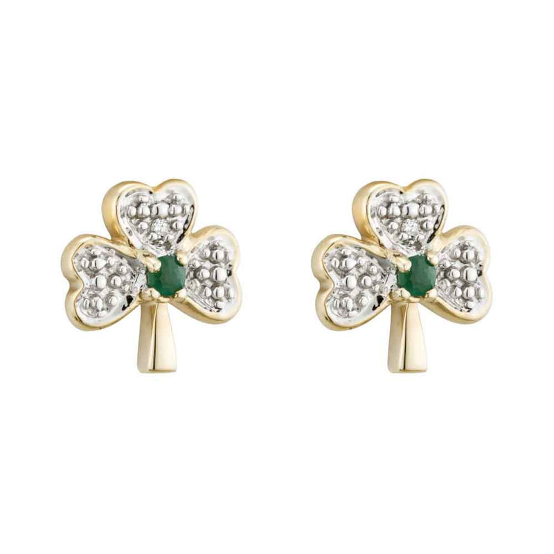 Elegant shamrock, 14k gold stud earrings with real diamond and emerald. A delightful combination of an Irish favorite, the shamrock and a jewelry classic, diamonds with the emerald, the color of Ireland. Comes in a presentation gift box.