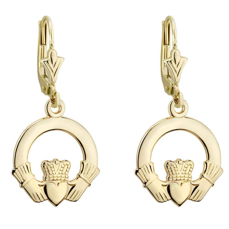 Drop earrings highlighting the famed Irish claddagh, symbol of love and friendship. Earrings: 0.5" x 0.5" with a 1.1" drop. Lever back fittings.